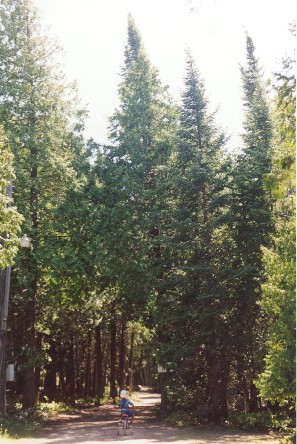 Katie Beth rides her bike through a forest of tall cedars at Camp Adanac.