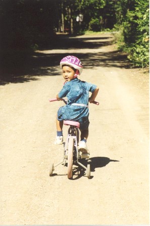 Katie Beth rides her bike down the Camp Adanac main road.