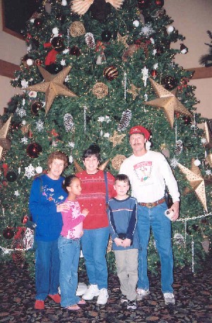Family photo in front of the tree in the lobby at Great Bear Lodge. From left to right are