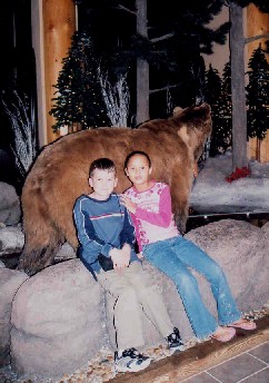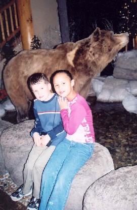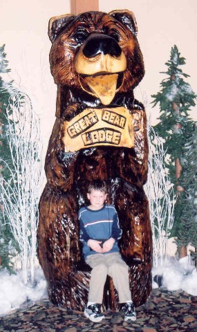 Jeremy poses on the lap of a big wooden bear at Great Bear Lodge.