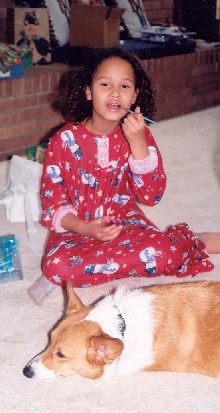 Katie Beth and our Corgi dog Molly on Christmas Day. Katie Beth appears