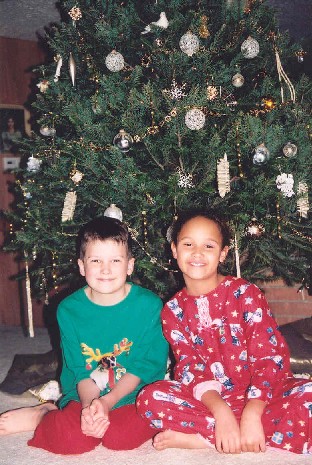 Katie Beth and Jeremy in front of the Christmas tree and Marjean and Tap's house.