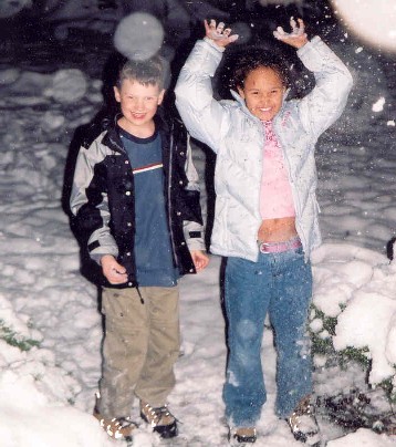 Jeremy and Katie Beth play in the snow in the back yard at Marjean and Tap's house.